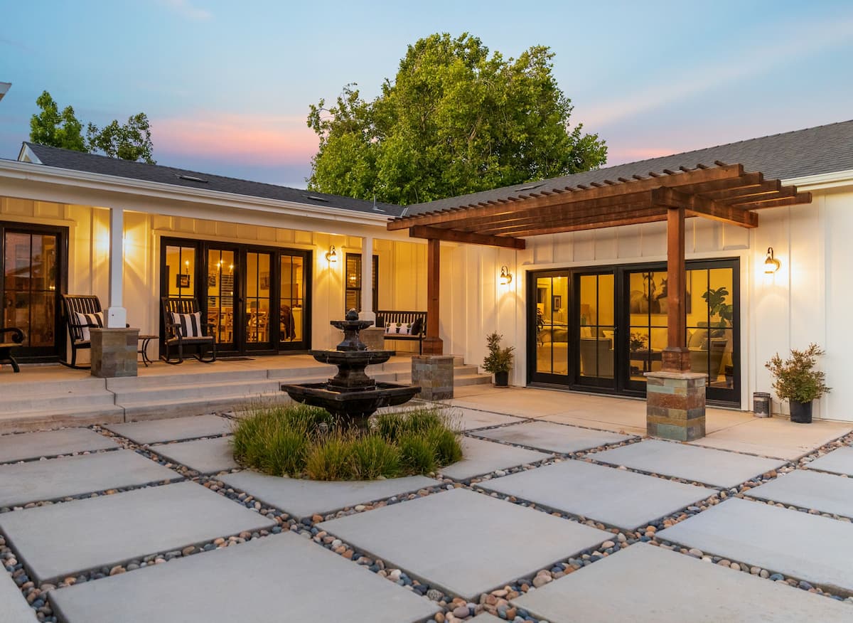 Because of the size of the landscape, the customer wanted multiple concept areas. A flagstone pathway with creeping thyme between the stones provided a soft, natural walkway leading toward the courtyard. The courtyard includes concrete and a water feature built on a float system, maintaining a modern ranch aesthetic while eliminating the need for manual refilling.