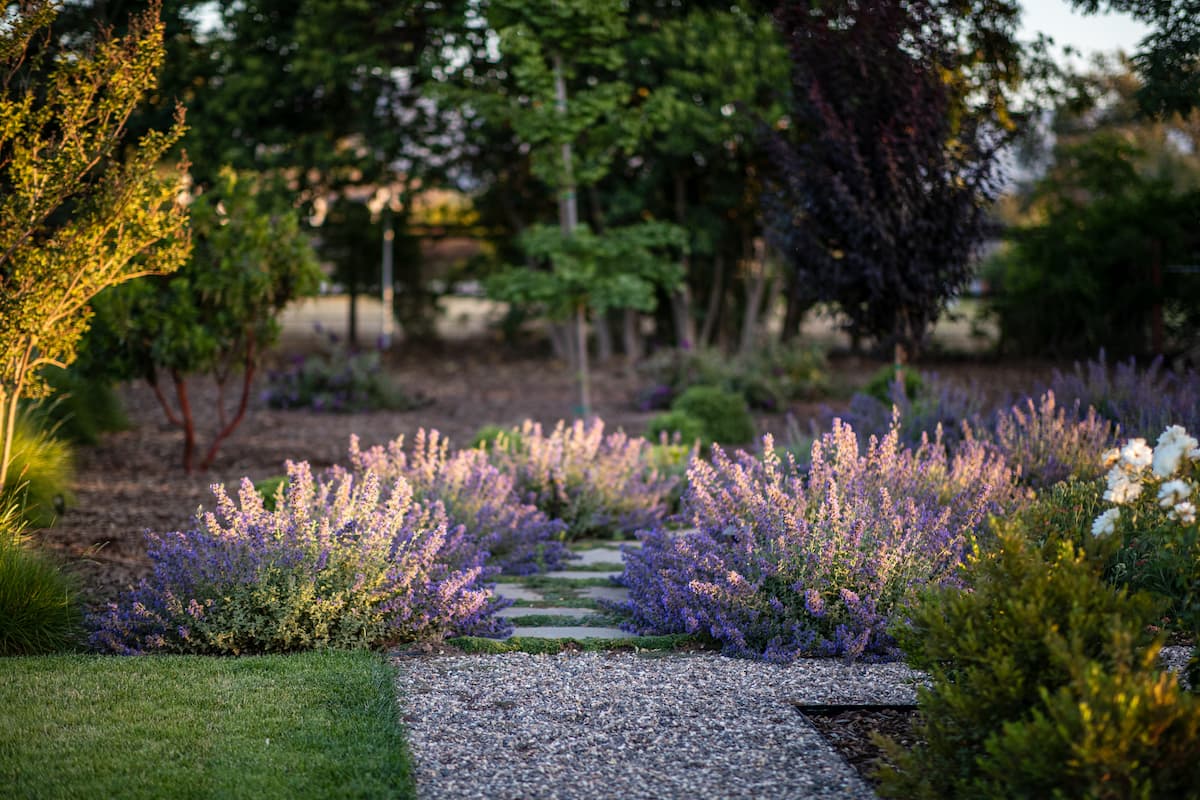 We began by creating a spacious gravel driveway capable of accommodating a large number of visitors, with enough room for a truck and horse trailer to comfortably turn around. The driveway was constructed with six inches of base material topped with one inch of 3/8” Pacific Brown gravel from Troesh Landscape Supply. The client selected a beautiful olive tree to anchor the driveway and create an English garden–style focal point. This established an inviting entrance for guests using the back Airbnb guest house, where we then transitioned into a natural pathway to help define a separate area of the property.