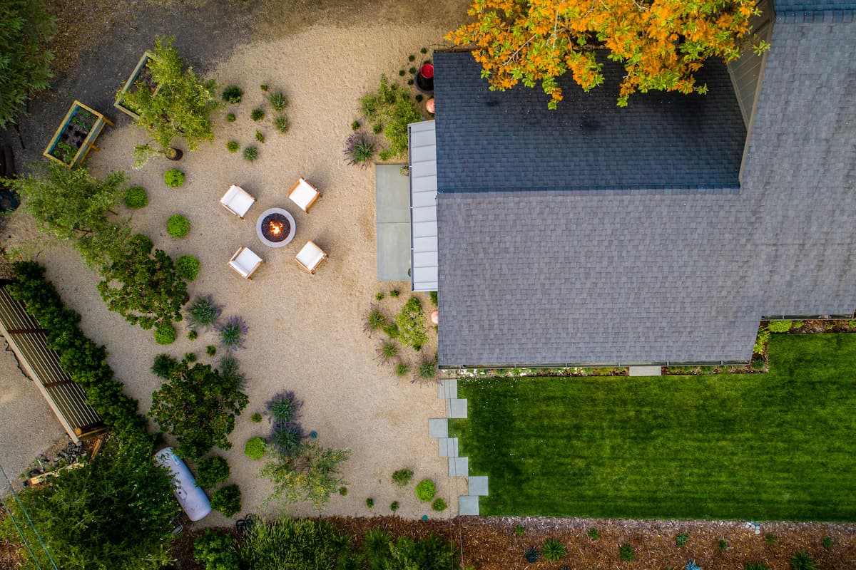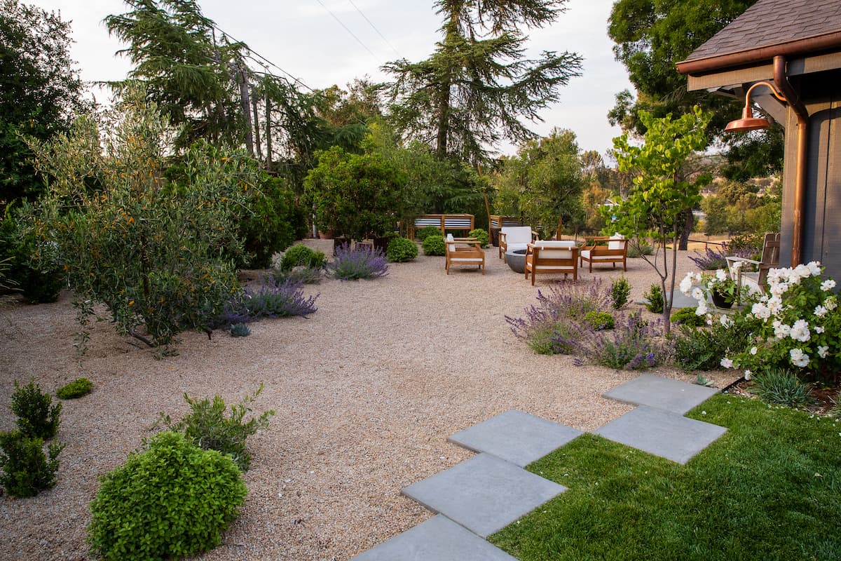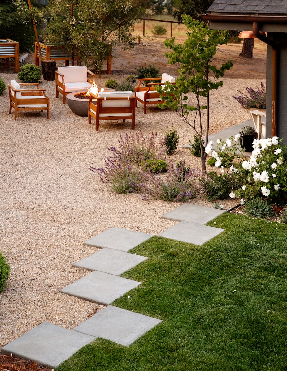 The property began as an open yard with a rolling hillside, and the clients wanted a natural outdoor hangout area centered around a custom gas fire pit. To give the space a more organic feel, we designed a gravel walkway and patio system and integrated planting pockets into the gravel to soften the look and create a unique texture throughout the yard.