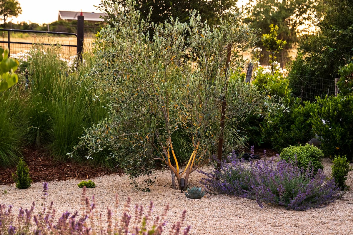 Since the property is in the countryside, landscape lighting played an important role. We used lighting to safely illuminate the walkway and highlight the Mediterranean-inspired plantings included in the design. We also took inspiration from the remodeled interior—mirroring pottery, colors, and certain design elements—and carried those ideas into the landscape to create a cohesive indoor-outdoor connection.