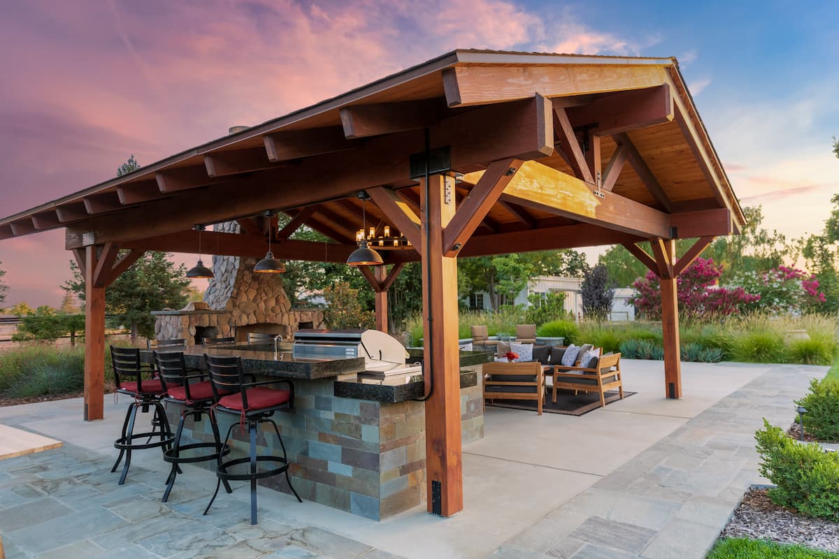 The customer incorporated some decorative tile details in their outdoor living area, so we overlaid a concrete pathway to create a smooth transition toward the outdoor kitchen. They wanted a complete outdoor dining experience, so we designed a space that included a wood-burning fireplace, outdoor kitchen, and a large seat wall for gatherings.