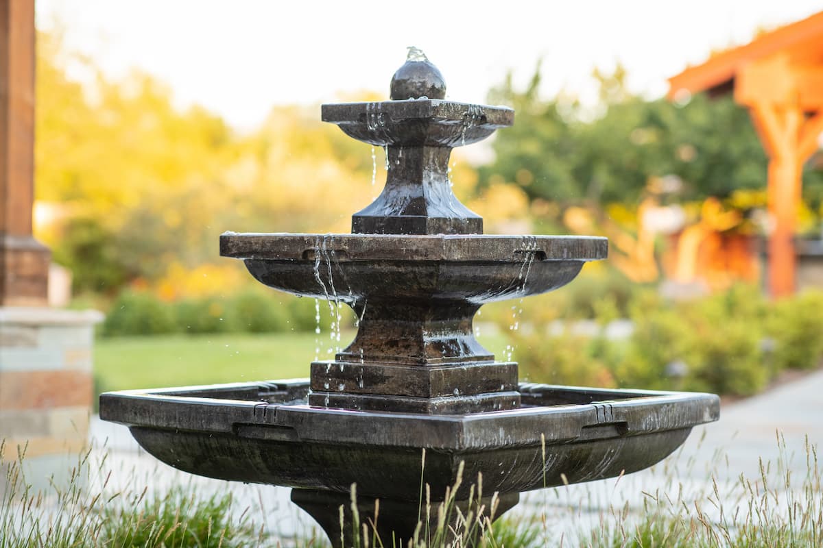 - Custom millstone and two-tier water features with up/down lighting