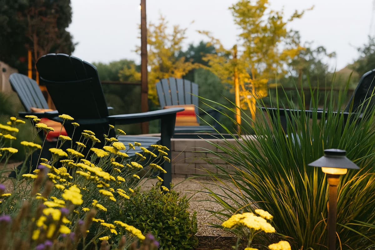 We added a custom fire pit area illuminated by bistro lights, creating the perfect space to relax and entertain in the evening coastal breeze.