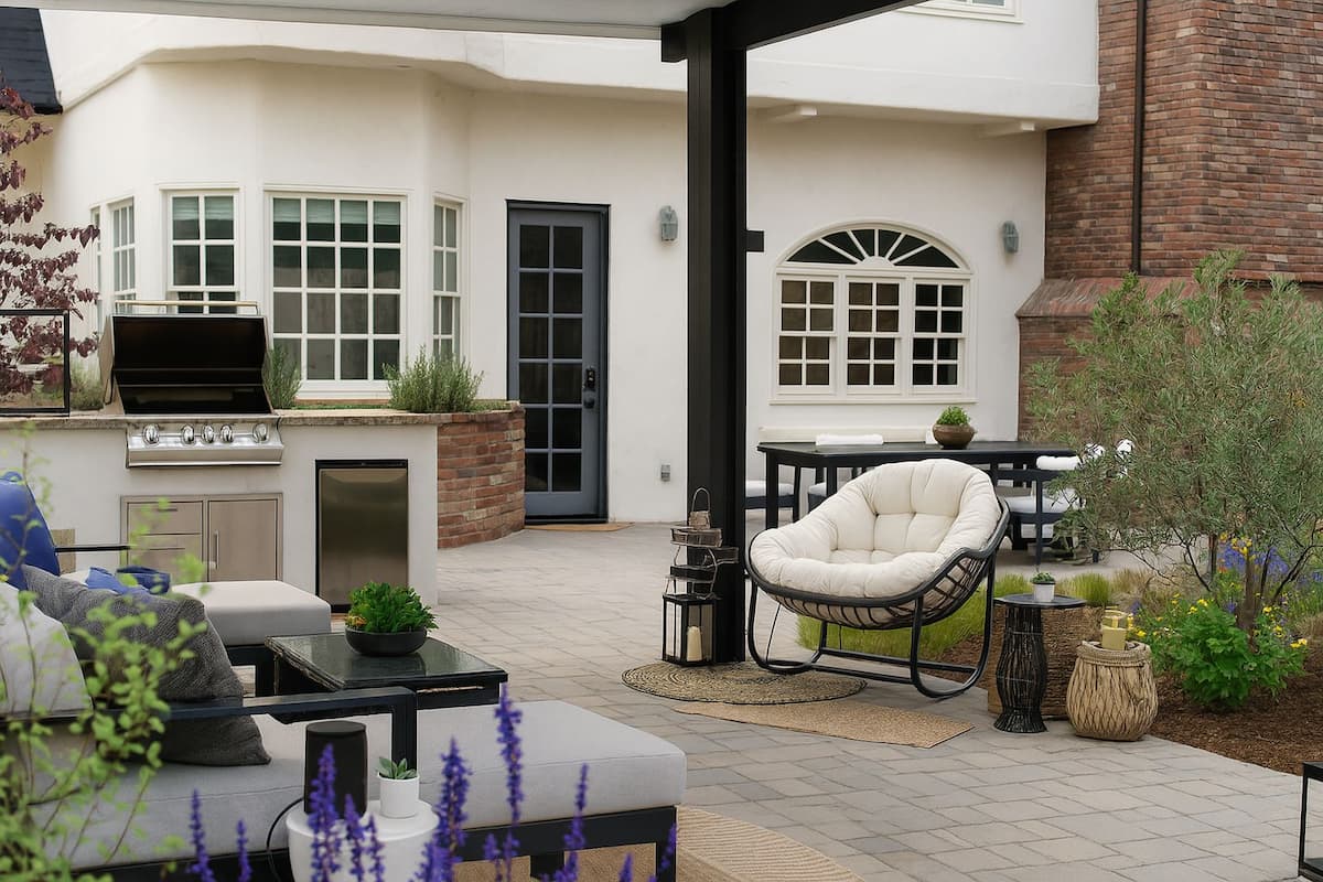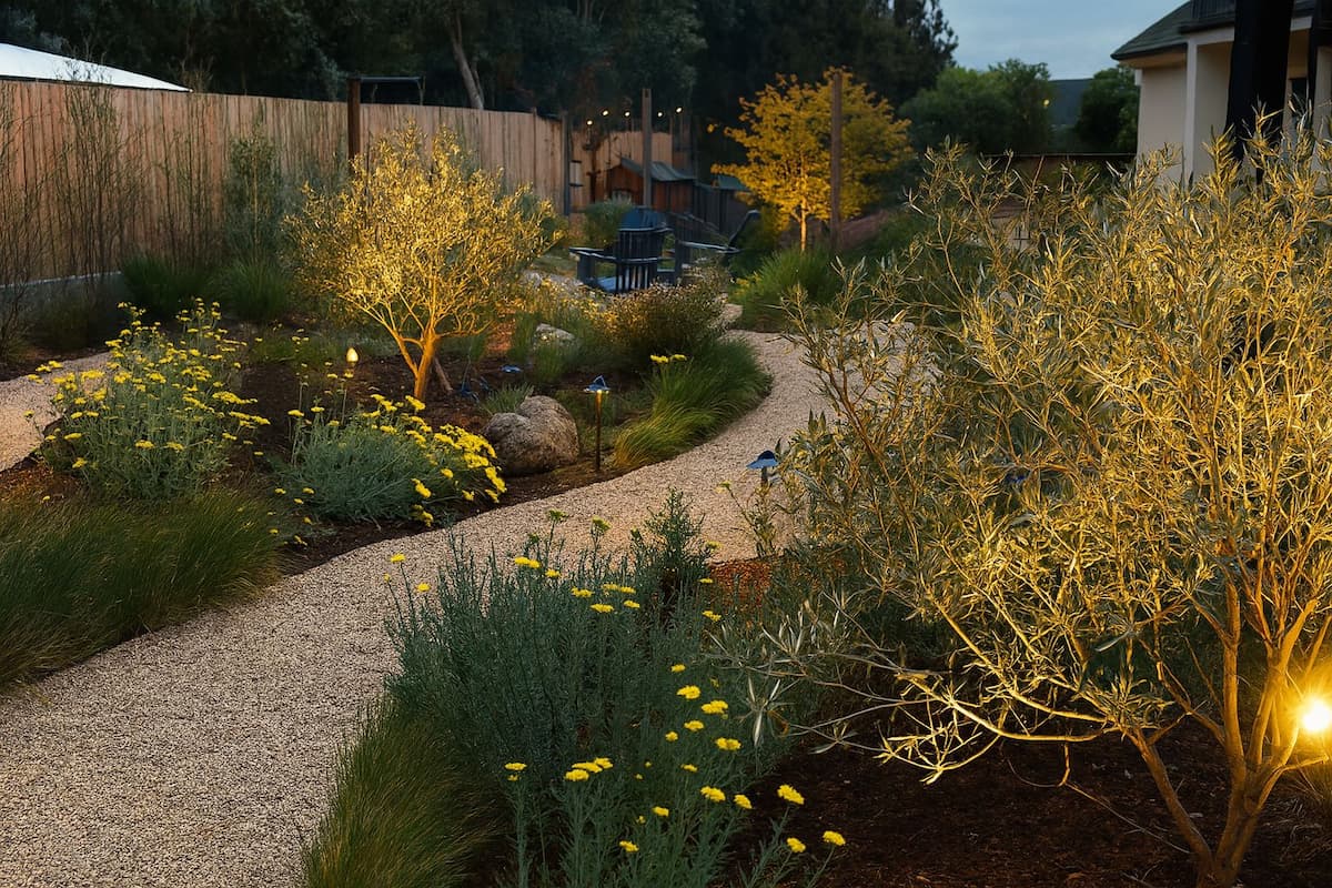 The new design features an outdoor kitchen island with natural gas for effortless cooking—no propane tanks required—along with curved walkways, multi-trunk olive trees, and vibrant, drought-tolerant plantings that thrive on the Central Coast.
